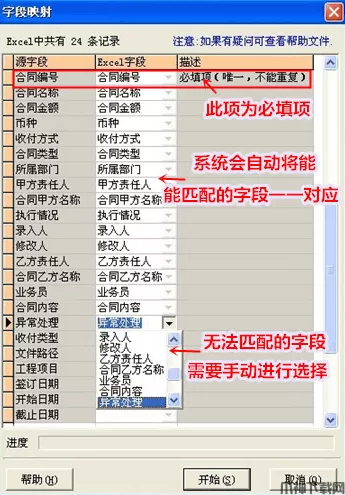 Excel字段名即是Excel表中的字段,您把“源字段名”和“Excel字段名”一一对应好,这样程序才能把信息导入到相应的数据库字段中,比如上图中的单位名称对应单位名称。系统会将Excel字段与源字段进行匹配,如遇少数无法匹配的字段需要手动进行字段选择,单击选中字段便会弹出下拉选择框,再选择字段。