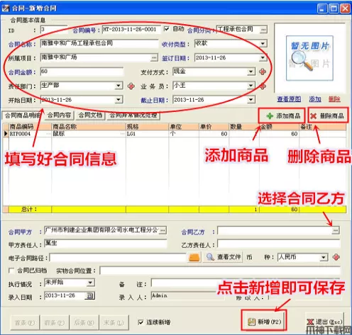 进入到新增合同界面中,首先填写好合同信息。在添加商品,选择合同乙方点击“新增”按钮保存即可。
