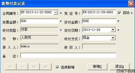 选择合同编号,填写付款金额点击“新增”按钮保存即完成一张付款单据(收款单操作类似)。