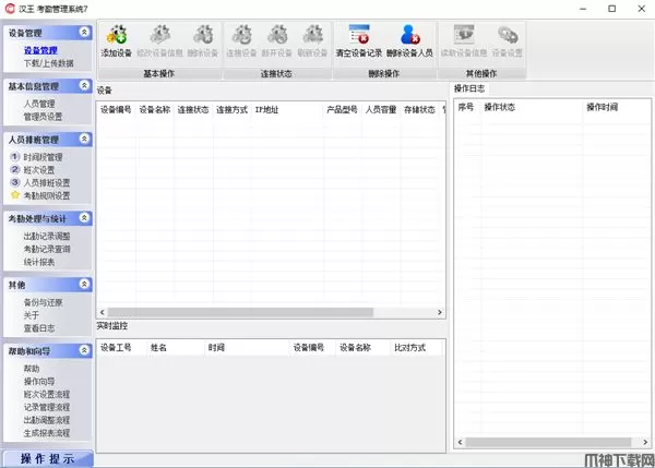 这一部分的内容是使用考勤管理系统对连接的人脸识别考勤设备进行管理、设置和数据传输,只有进行了正确的设置,本系统才能正常的完成与设备的通信,实现人员信息的下载和上传等操作。