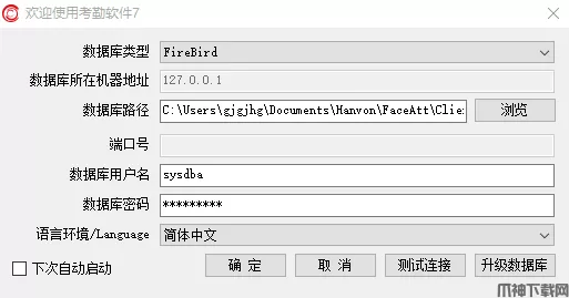 3、打开汉王考勤管理系统服务端(部分系统会显示安装一个插件进行安装即可),点击升级数据库后再点击测试连接后在点击确定即可;