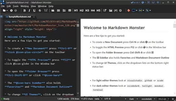 4、Markdown Monster可以从浅色和深色主题中选择,并选择单独的编辑器和预览主题。
