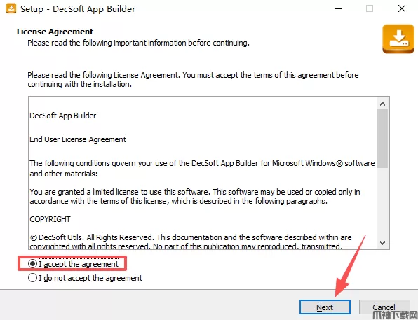 2、点击同意条款协议后,再点击Next。
