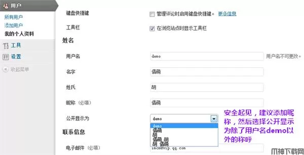 需要注意的是,建议填写一下昵称,然后设置【公开显示为】选择除了 登录的用户名 以外的其他名称,这里的内容会在网站的前台显示,如果你直接使用 登录的用户名,存在安全隐患。