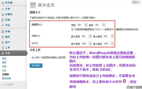 默认情况下,每一张上传的图片都会生成上面几种规格的图片(看图中文字介绍),如果不需要生成多种规格占用空间,可以全部设置为零,保存即可。