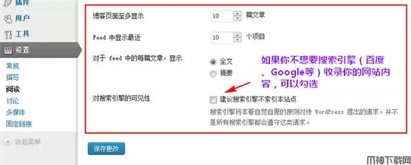 可以简单设置下页面显示文章的篇数(不同的主题设置可能不能),还可以设置是否让搜索引擎收录。