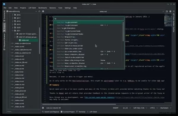 快速打开功能是Kate一直以来都有的一项功能,在过去的一段时间,这一功能并没有得到太多改进。现在,随着新的21.04版本的发布,这一功能发生了质的改变,包括模糊匹配以及一些新的UI。