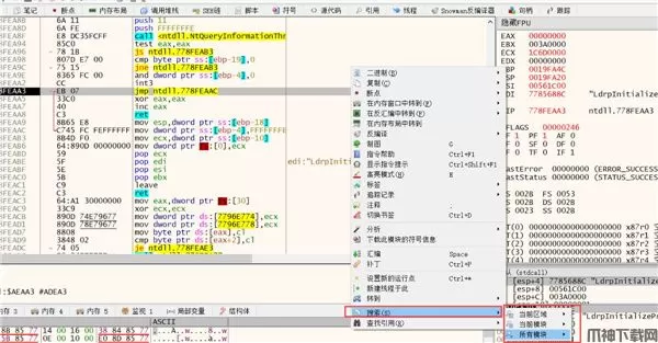 2、字符串搜索功能,我们可以通过x64dbg的字符串搜索功能来查看内存中加载的字符串,具体操作步骤为:CPU(反汇编)窗口->鼠标右键->搜索->选择模块(根据个人需求选择,一般选择当前模块,前提是得先执行到主模块)->字符串