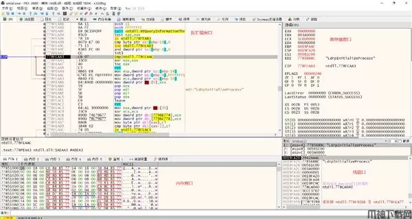 将目标程序用x64dbg(实际上是x32dbg)打开,看看x64dbg的界面,这里常用的窗口都使用红字标注出来了