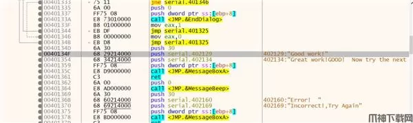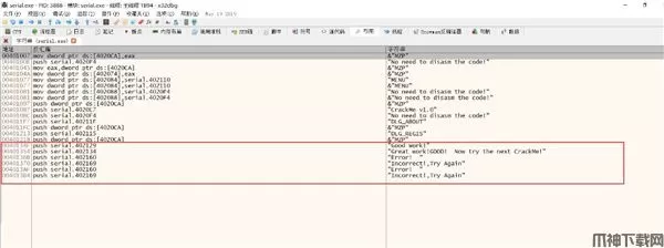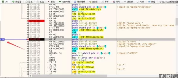 可以看到,源程序是使用了2个处理函数,分别对用户名和密码进行了运算,用户名运结果放到了eax中,密码运算结果放在ebx中,比较二者运算结果是否相同,决定调用注册成功函数还是注册失败函数。(由于此时只是介绍工具使用,故不展示算法分析部分,大致流程为eax = F1(用户名),ebx = F2(注册码),cmp eax,ebx)
