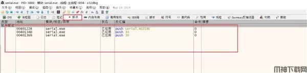 5、下软件断点,运行程序,观察是何处调用了该代码(鼠标点击相应行,按下F2即可快速使用软件断点),下软件断点后,地址处会变为红色,断点窗口能看到相应信息