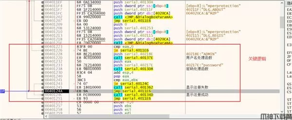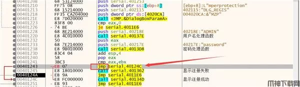 8、这时候,我们使用x64dbg的代码修改功能,将对应的注册失败验证跳过,即可完成破解:将0x401243处的je 0x40124C改为jmp 0x40124C(双击代码行即可修改)