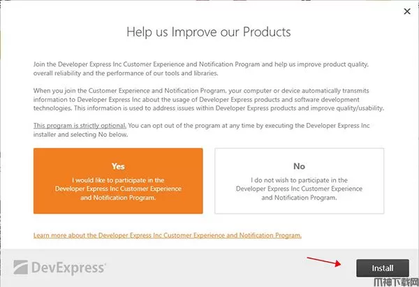 4、选择yes,参加Developer Express Inc的客户体验和通知计划,然后继续安装;