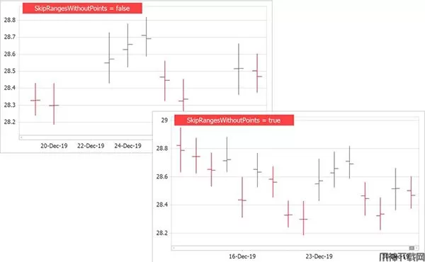 包含一个新的SkipRangesWithoutPoints选项。启用它可以自动排除所有没有数据点的轴范围。此功能对财务图表特别有用-您不再需要手动定义非工作日期间隔。