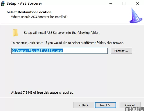 3、选择程序的安装路径,默认路径为C:\Program Files (x86)\AS3 Sorcerer,可点击browse更换安装路径,或直接默认,请确保所选择的硬盘满足其安装要求,然后点击next