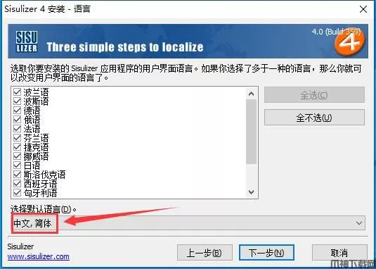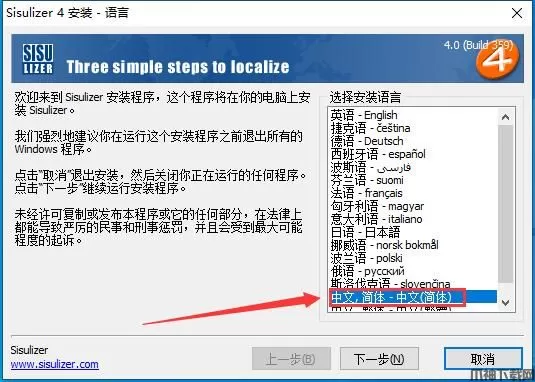 1、将下载完成的压缩包进行解压,然后双击启动sisulizer程序,进入安装主界面,一定要记住选择“中文”。