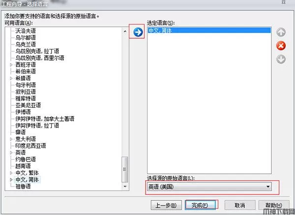 7、接下来要选择一下本地化所需要用到的语言,比如我们要汉化程序,即选择简体中文,然后点击上面的蓝色箭头,将此语言移动到选定语言栏中。然后再选择程序的原始语言,就在右下角的选择设置中,最后点击完成就开始了。