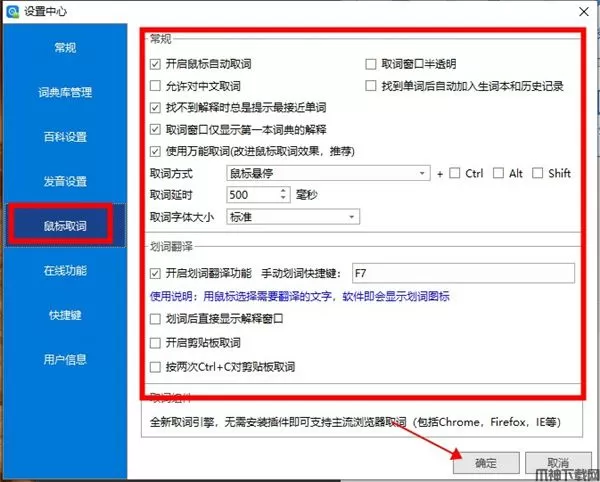 2、点击鼠标取词,这里很多功能,用户可以根据自己的喜好来选择,选择好后点击确定即可。