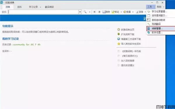 欧路词典的每部扩展词典一般包含两个文件:mdx文件和mdd文件。mdx文件是标准的电子词典文件格式,里面储存的是一部词典的文本信息。mdd文件里面包含的是声音和图片。有的词典只有一个mdx文件,没有mdd文件,就代表这部词典是没有单词发音,不能点击发声的。欧路词典添加词库步骤如下:1、依次点击欧路词典主界面右上角“工具”---“词库管理”