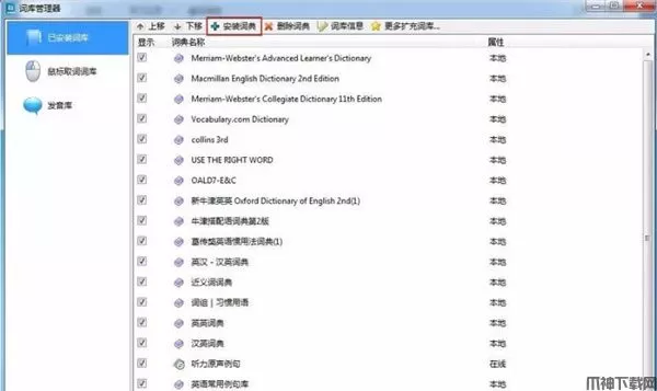 5、安装完全部词库后,可以在词库管理器页面,单击选中任一词库,然后点击上方工具栏内的”上移“”下移“按钮,调整此词库在查询单词释义时出现的先后位置。