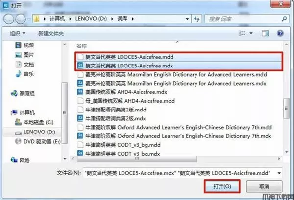 3、按住 CRTL键同时选择一部词典的mdd文件和mdx文件,点击“打开” (注意mdd和mdx这两个文件的文件名必须保持一致)