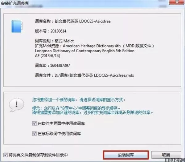 4、出现询问是否安装词典的对话框,点击“安装词库”,即可完成扩展词库的安装。