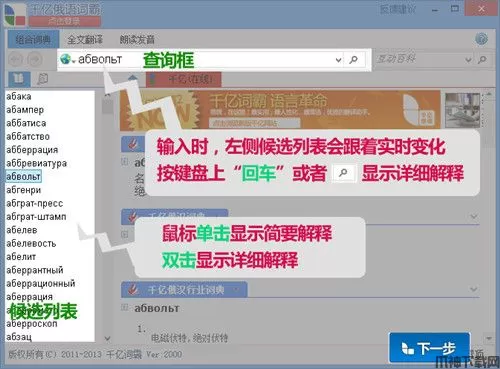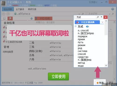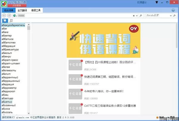 千亿词霸,一般又称千亿俄语词霸、千亿词霸俄语字典,是一款主要针对俄语翻译所打造的一款电子词典软件。