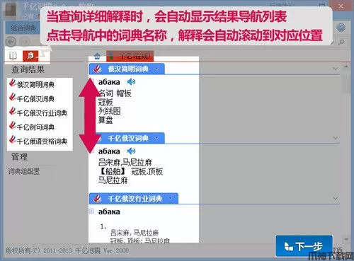 当查询详细解释时,会自动显示结果导航列表,点击千亿词霸导航中的词典名称,解释会自动滚动到对应位置。