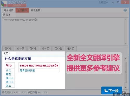 全文翻译新增查询选中词的功能,在原文框或解释框内双击查询词,即可在千亿词库内查询,得出精确的结果。
