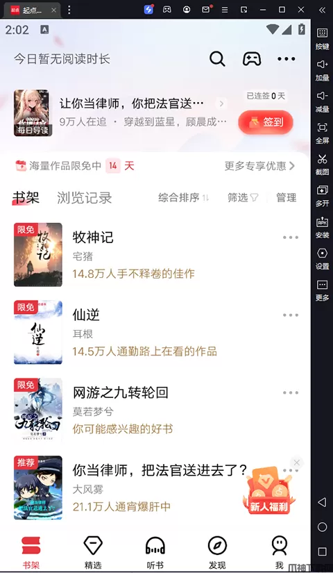 看小说是现在大多数用户比较喜欢的打发时间的方式,如果用户想要第一时间看到自己喜欢的小说,那么这款起点读书电脑版就是你最需要的,作为最全最大的中文原创网络文学网站——起点中文网,相信众多读者都不会陌生,许多实体小说上都印有起点中文网的字样,众多作者也都以进入起点为目标,当然现在众多文学网站遍地开花,其他网站也有不错的待遇和小说。起点读书虽然大多数的书籍都是需要用户付费购买观看的,但是偶尔也会有活动让用户们免费阅读,各种热书、新书层出不穷让你一次看个够。除此之外,起点读书还会不定期的举办各种活动,有趣更有料,畅读券、起点币、经验值等等福利大礼让你收到手发软。本站为大家提供的是起点读书电脑版,下载完成后通过安卓模拟器打开即可。