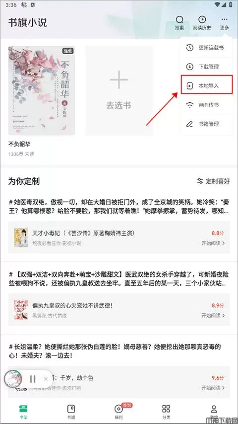 1、想到导入自己的下载的小说非常简单,只需要在首页点击右上角的“更多”,选择“本地导入”;