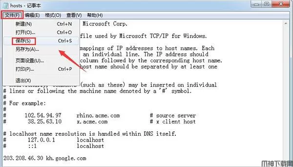 4、点击hosts 文件的文件--保存后退出;