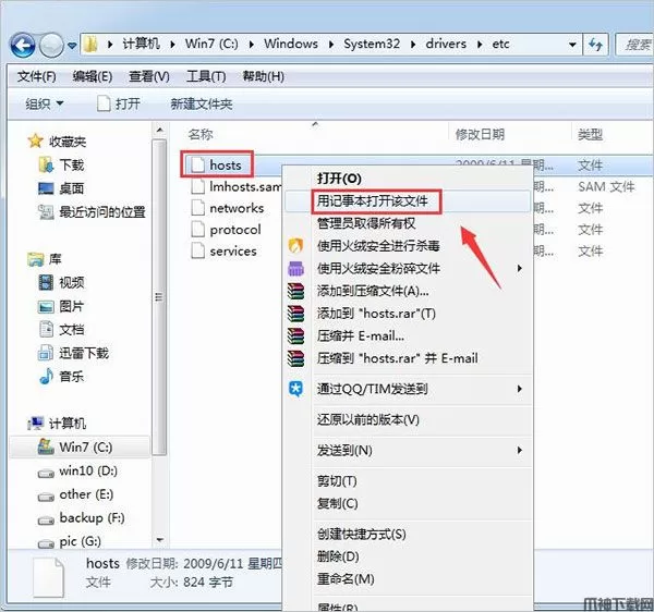 2、使用记事本的方式打开其中的“HOSTS”文件。