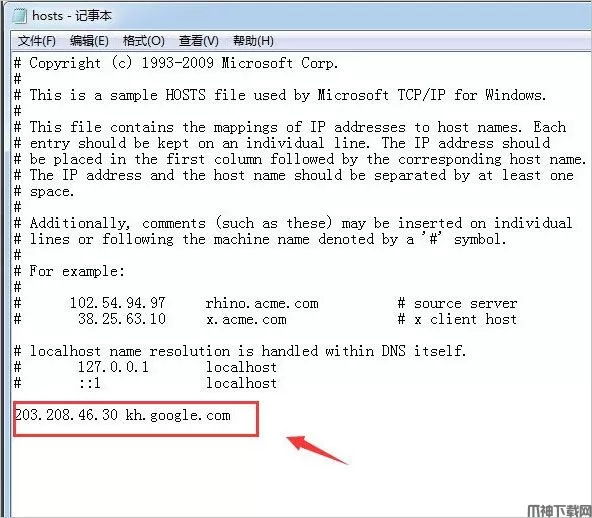 3、进入hosts文件,在最后添加203.208.46.30 kh.google.com/203.208.50.103 www.google.com,如下图所示;