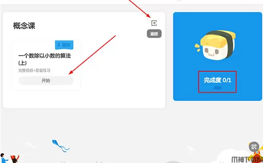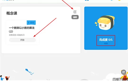 2、选择完课程用后,大家可以在左边看到可以开始学习的完整视频和配套练习,右边显示此课程的完成度,如果你选错了课程,想要返回上一步,也可以点击上方的“返回”选项进行返回,之后只需点击“开始”选项即可,如下图所示: