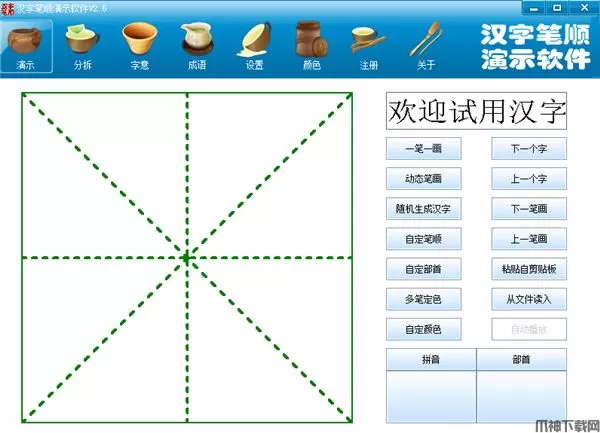 1、汉字笔顺演示软件可演示6763个简体国标汉字的笔画书写顺序,演示方式包括一笔一画及动态笔画,其中动态笔画就是模拟书写汉字方式演示汉字顺笔,效果逼真。