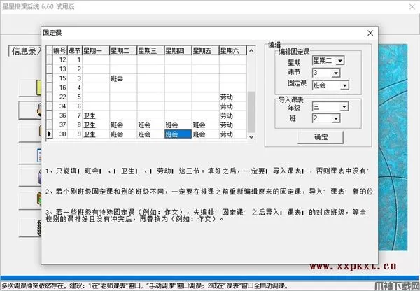 3、每周可设置固定课(班会、劳动 、卫生),可以是统一的(每个班都一样),也可有特例( 例如:某个班上“讨论”课,而别的班不上;某个班虽上“周会”但和别的班时间上的不一样)。
