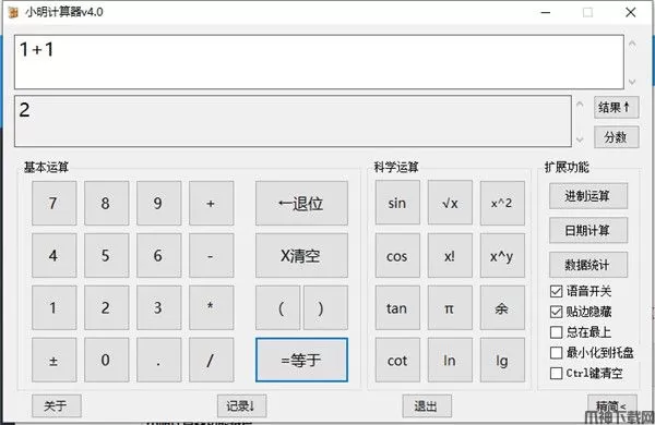 小明计算器官方版是一款先进的计算器,它集基本运算、科学运算、扩展运算等功能于一身。小明计算器是市面上计算器各大优点的一款强大的科学型计算器。符合国人的思维逻辑。例如:市面上的计算器在计算sin45时,必须先输入45再输入sin,而小明计算器可直接输入sin再输入45。更符合国人的操作需求,结构独特:退格功能可实现全部算式的删除修改功能,更加智能化。例如:市面上的计算器在输入1+2+3+44时,如果发现输入错误,只能修改最后一个数值44。而小明计算器的退格功能可以实现全部算式的删除修改,而不用清空重新输入,运算灵活:支持括号、多重括号以及科学计算中的括号运算,灵活实现表达示的智能判断与运算。历史记录,让您在核对数据时更加方便。小明计算器完全免费,拥有基本运算、科学运算、扩展运算等多种功能,远远强于windows系统自带的计算器,能够为用户提供强大的科学型计算,是广大学生学习的好助手。这款软件完全免费,无任何插件,真正的绿色软件。需要的朋友们,赶快来下载吧。
