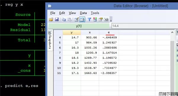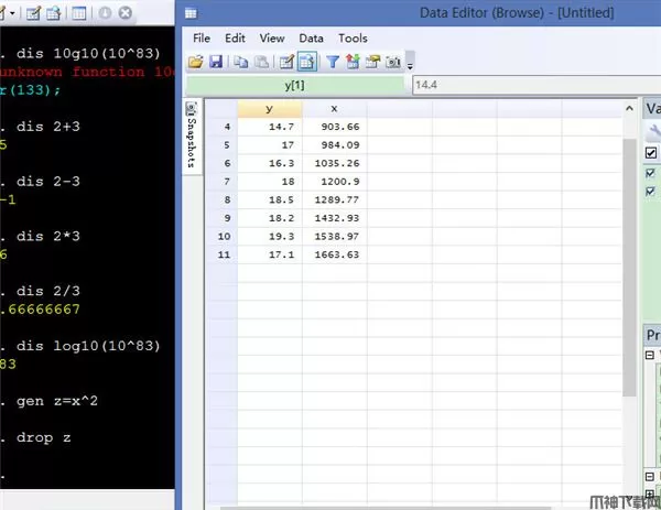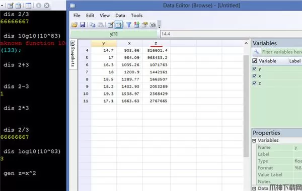 例如,我想生成一个新变量z,它等于x的平方,则输入gen z=x^2。打开数据浏览器,就可以看到数据中多了一列。