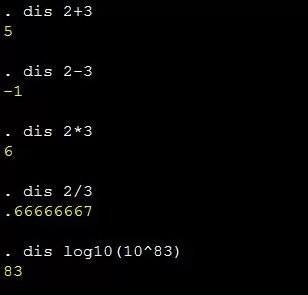 5、display命令(该命令也可以简写为dis):作为屏幕显示的统计计算器来用,用来进行一系列计算,进行最基本的加减乘除,也可以进行对数运算。