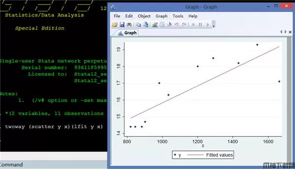 3、画出拟合线命令:twoway (scatter y x)(lfit y x)