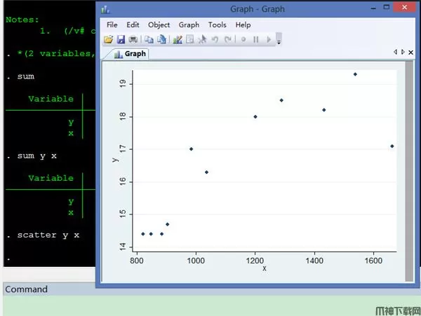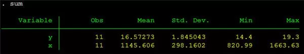 利用这个命令,可以得到观测案例数(Obs)、变量的平均值(Mean)、标准差、最小值和最大值。(在这个例子中,x为自变量,y为因变量)