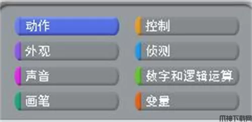 LOOKS(外观)--切换造型、背景、显示文字、改持特效、... SOUND(声音)--播放声音、乐器音效 PEN(画笔)--下笔、笔颜色、大小、色调
