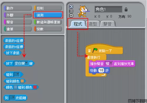 当我们点选指令分类后,底下的指令区会跟著改变,如图我们点选侦测分类,底下就会出现侦测分类的全部指令,中间的程式码区也就是我们写程式的区块,把我们 的指令拖曳至程式码区。