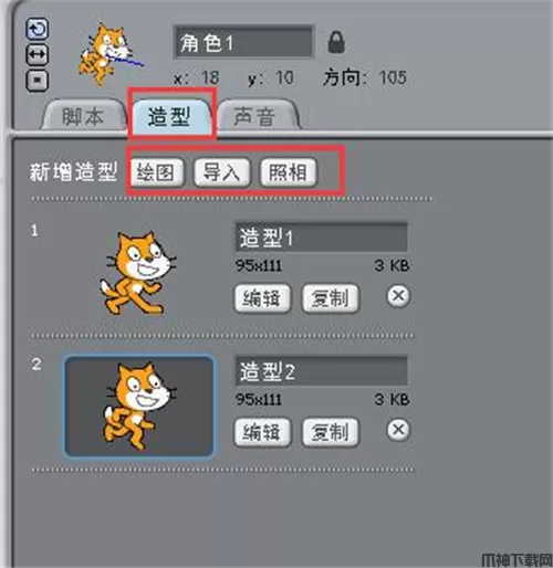 我们可以自行画出角色的各种造型或者使用汇入方式,先使用别的绘图软体绘制作后汇入。 也可以载入不同的物件到造型区中。但同一时间只会出现一种造型。 右下方物件代表上场角色,可以多个同时出现。