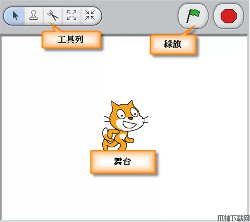 选择工具后再点选物,複制、剪下、缩放的动作。 程式以按下绿旗键,开始执行程式,红色按钮则是停止。 中间空白大区域则是舞台,物件都会在上表演。