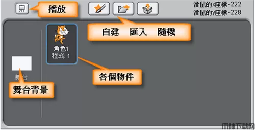 舞台背景则呈现目前舞台的背景,点选舞台,接著选背景后按汇入就可以取自然、户外...背景 自建、汇入、随机则可以使用自画、汇入及随机方式来加入物件角色 大区域部份则是各个物件