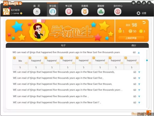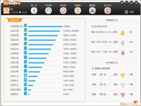 (5)口语等级:口语等级的进阶规则详见点“击用户头像——我的空间——我的荣誉——等级说明”。