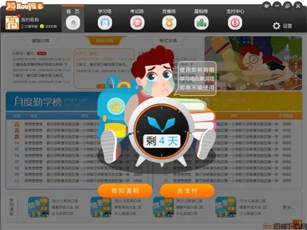 表示您的服务即将到期,到期后各终端"学习场&单词场"将不能继续使用,需要您前往支付中心通过微信或支付宝进行支付后,继续使用全部功能.另外,微信关注3E口语家长通公众号,绑定孩子3E账号后,也可在"个人中心——我的支付"中进行支付.