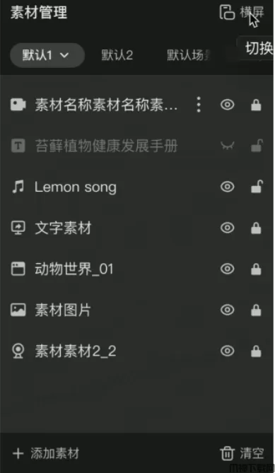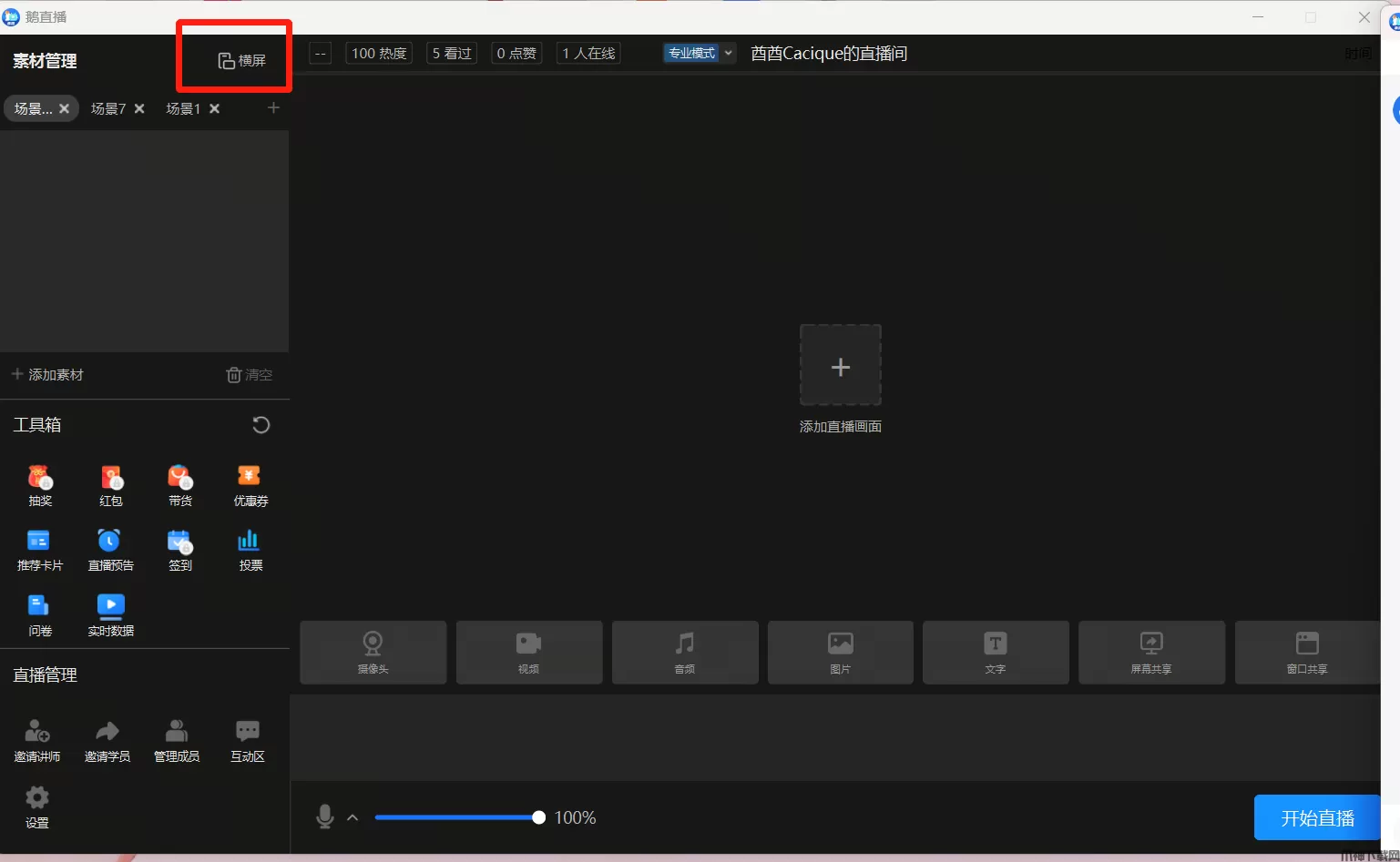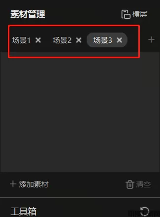 (2)横屏画布/竖屏画布 分别可以使用三个场景,每个场景下可以添加素材。点击场景tab,直播画面跟随切换。